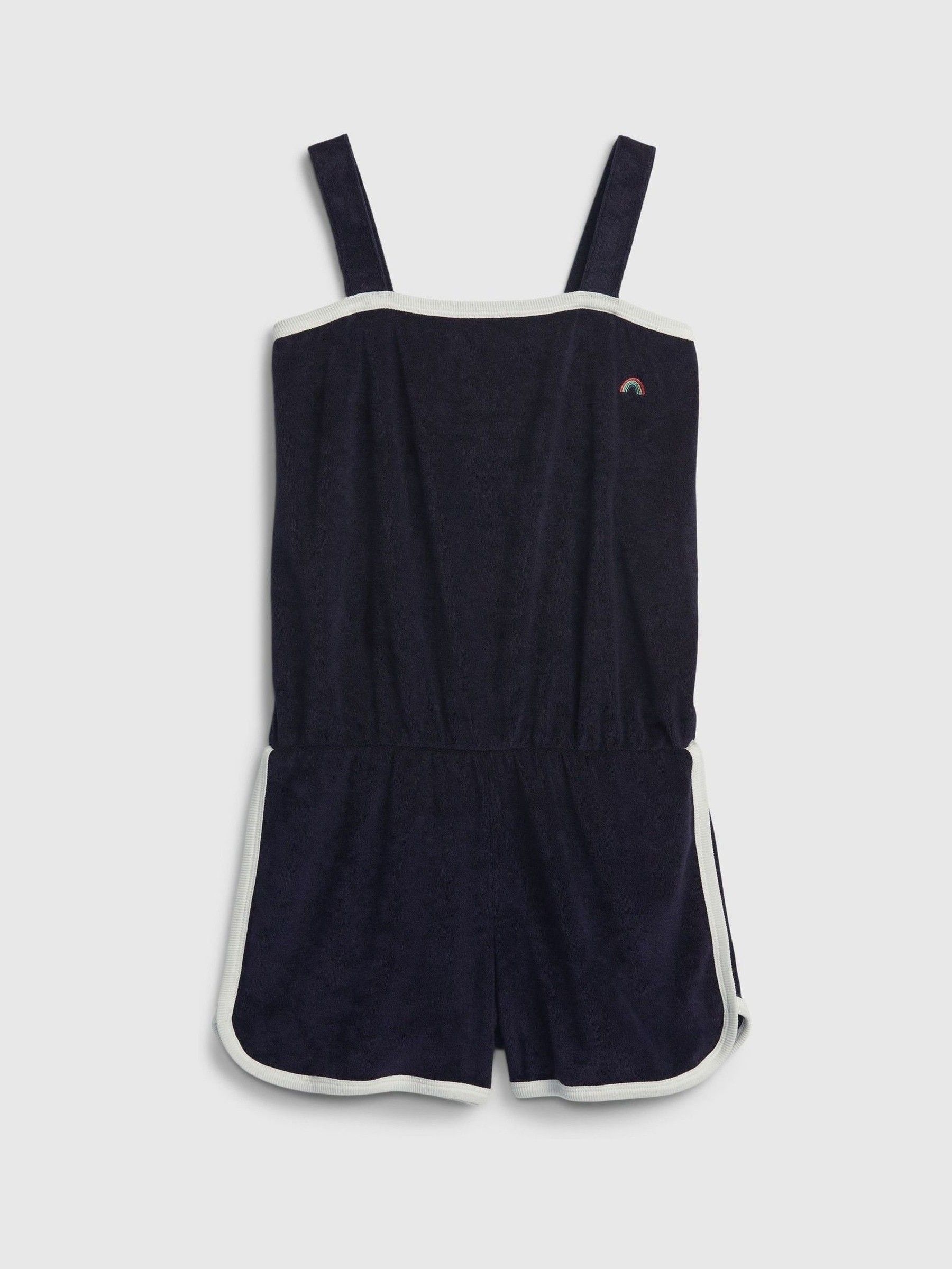 Soft towel terry knit. Squareneck tank straps. Cinched elasticised waist. Dolphin hem at leg openings. Machine washable. 84% Cotton, 16% Polyester.
