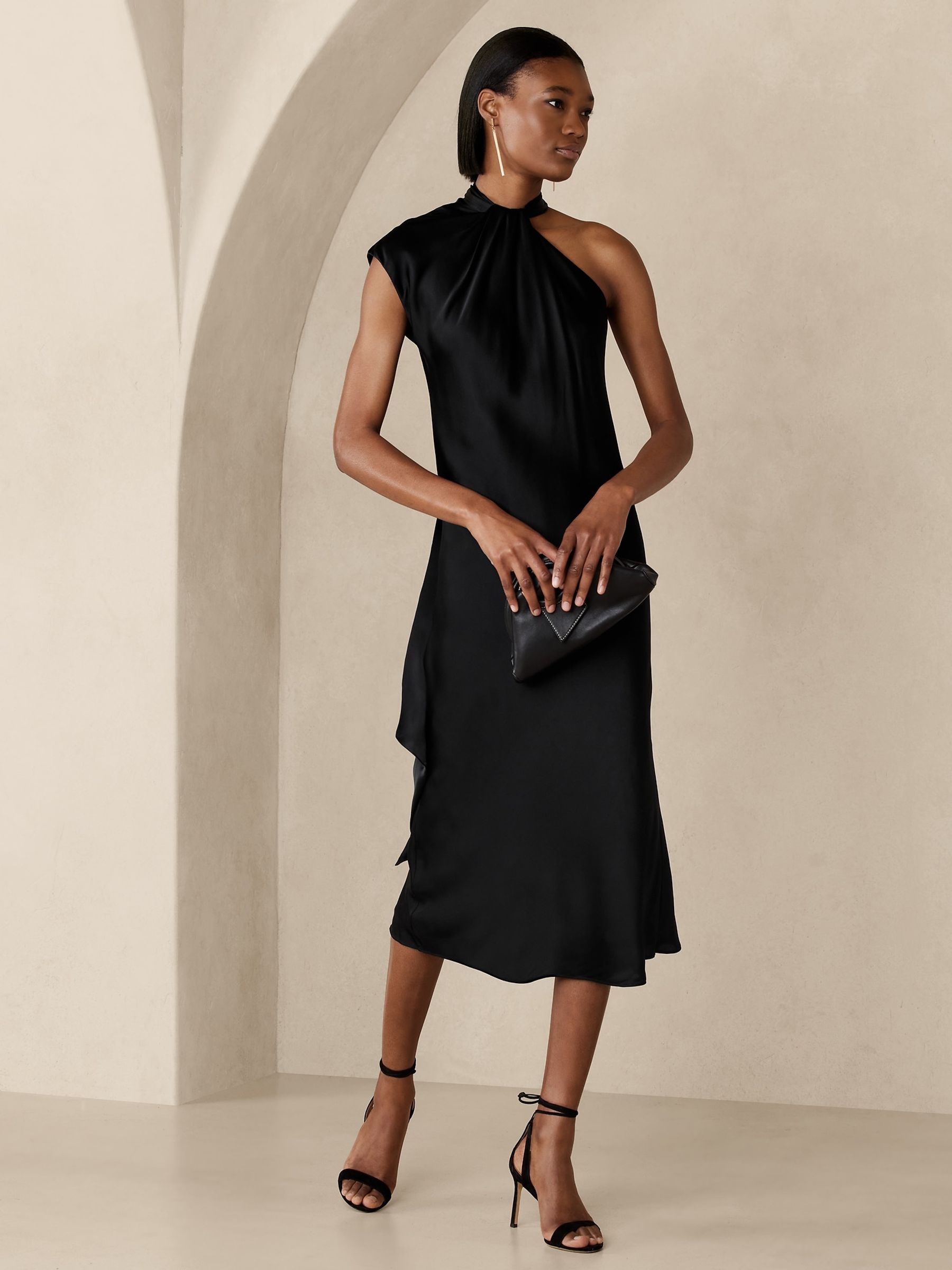 This attention-grabbing midi dress is made from our signature silk charmeuse, specially cut for a beautiful drape, with an asymmetrical neckline that celebrates expert tailoring.Product Details: Expertly cut for a straight fit Draped halter neckline with pleated detail and tie back Centre back slit Asymmetrical neckline Fit & Sizing: Model is 5’10 and wears a size S Fabric & Care: Fully lined Midi length Main 100% Silk. Lining 100% Polyester.