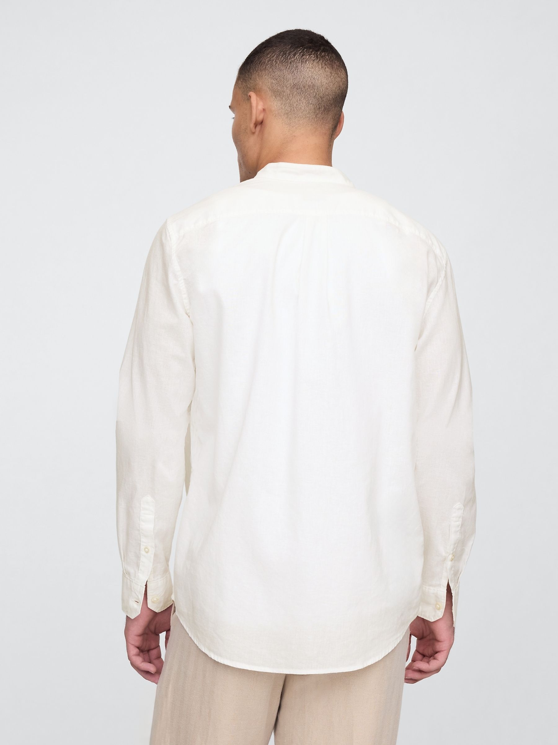 Soft textured linen-cotton dress shirt Band collar button front Long sleeves with button cuffs Machine washable. 55% Linen, 45% Cotton.