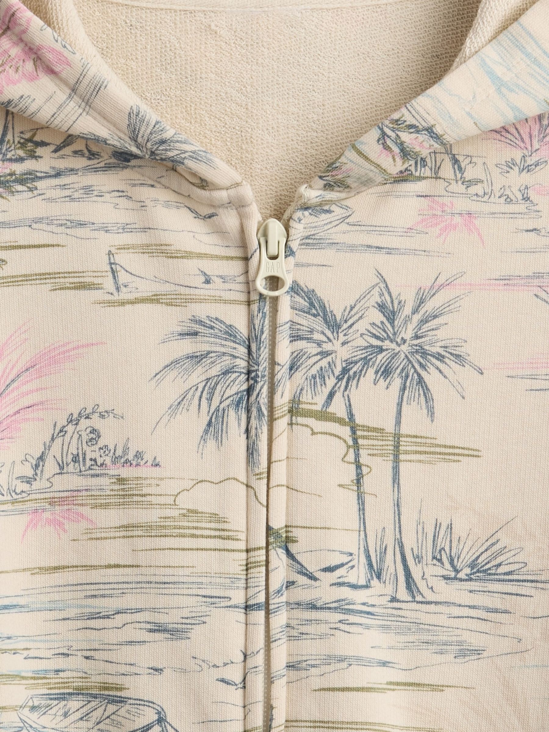 Soft comfy fleece Dropped shoulder long sleeves with banded cuffs Hood zip front Elasticised hem Allover print Straight relaxed fit Hits just above the hip Machine washable. 79% Cotton, 21% Recycled polyester.