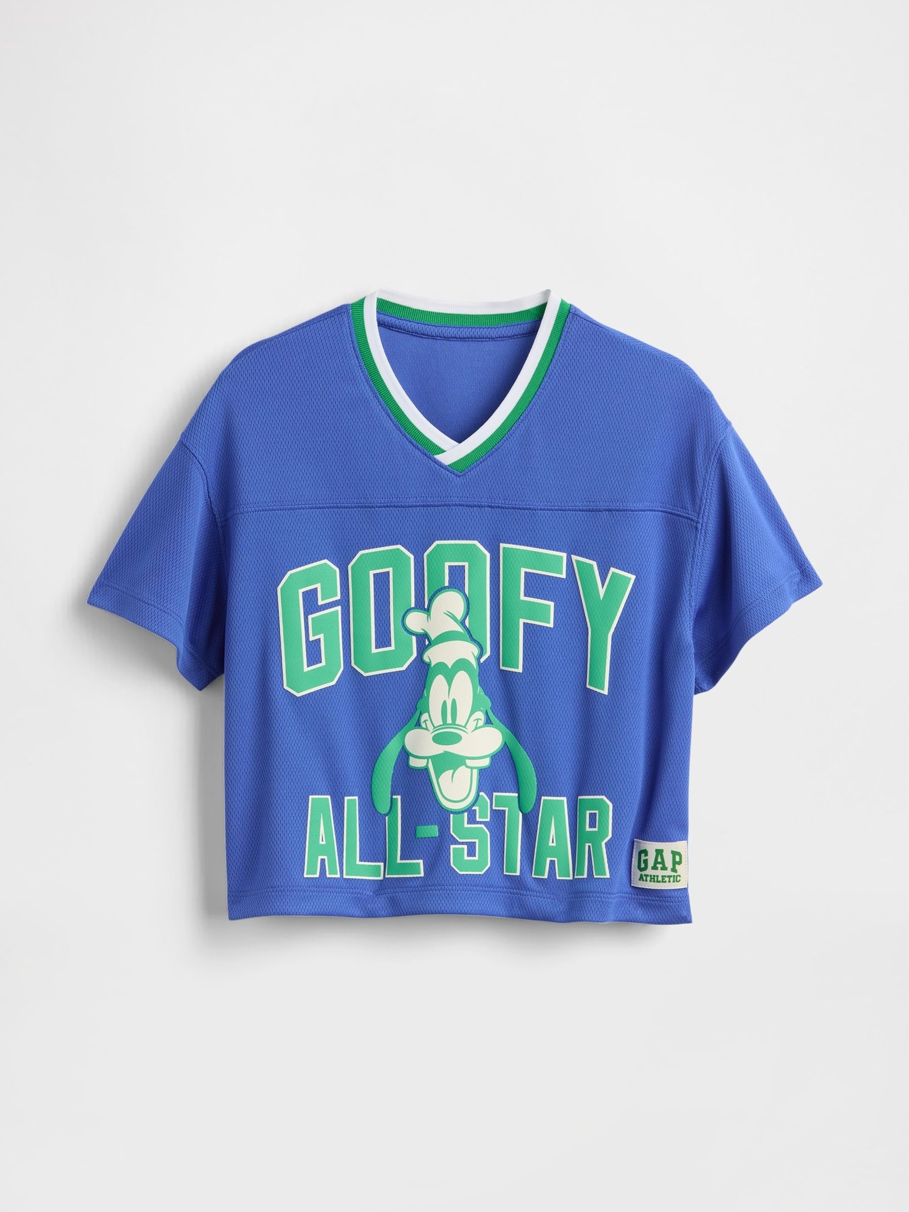Through RISE Reimagining Industry to Support Equality and Gap Inc.'s Programme P.A.C.E. Personal Advancement and Career Enhancement, we support people who make our clothes to build the skills, knowledge, confidence, and resilience needed to advance in work and life.e.Soft breathable mesh jersey T-shirt Moisture-wicking helps keep skin dry Â. Banded v-neck Short sleeves with drop shoulders Assorted Varsity-style Disney character graphics with Gap Athletic logo at front This T-shirt is made with polyester Compared to virgin material, using recycled materials helps to reduce resource use and waste This product was made in a factory that invests in gender equality and women's empowerment  Learn more here Relaxed, easy fit Hits at the hip Sizes range from baby to toddler Machine washable. 100% Recycled polyester.
